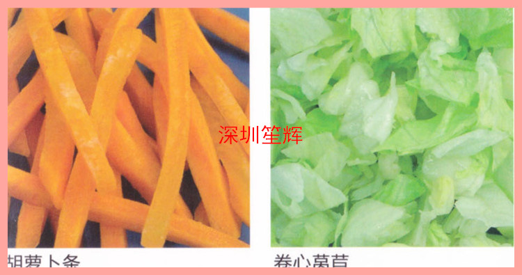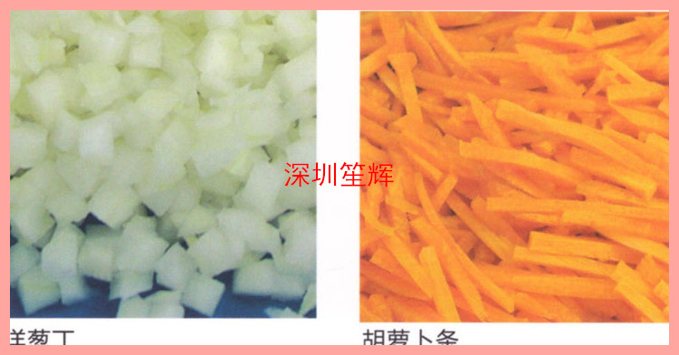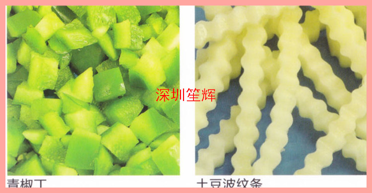 高速切丁机可以制作球形水果条,例如胡萝卜,土豆,芋头,红薯,黄瓜,洋葱,辣椒等,更是是柔软多汁的水果,例如番茄,苹果,雪梨,草莓,芒果,菠萝,木瓜等,迅速切丁或切条(可以切成波浪状的条),机械可以轻松变换不同的切割尺寸和形状,厚度可以调节,并且可以操作安全,切丁迅速,制品均匀美观。适用于食品加工厂,餐饮业,饭堂。