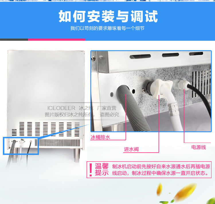 亲爱的,这台机器是我们从“肯xx冰块事件”中考虑的。因为制冰机是高精度,高强度的工作机。清理并非易事。许多死角无法真正扫除。老式的启动自动清洁功用无法真正清洁死角。我们在2014年启动紫外线杀菌后,发现紫外线会损坏机器。因此,派工程师前往美国,意大利,日本,韩国。并成功开发了三级净水器无菌制冰机,用以除水和杀菌。在此基本上,机器的使用寿命更长,输出更平稳,冰的使用更安全。