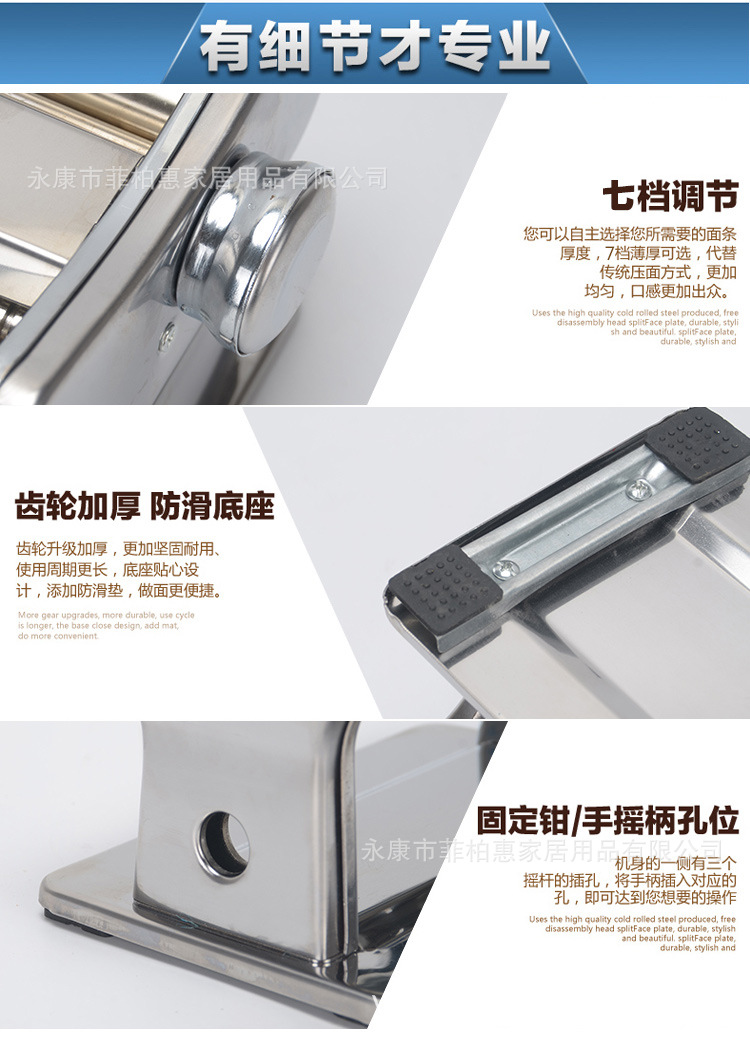 1.面皮厚度档数六档,机器配置有厚,薄和圆形的面条刀辊。除了压制粗细的面条外,该机器还可以压制面条,饺子包装纸,bun头包装纸,馄饨皮和其他形状严整,对称的面条。