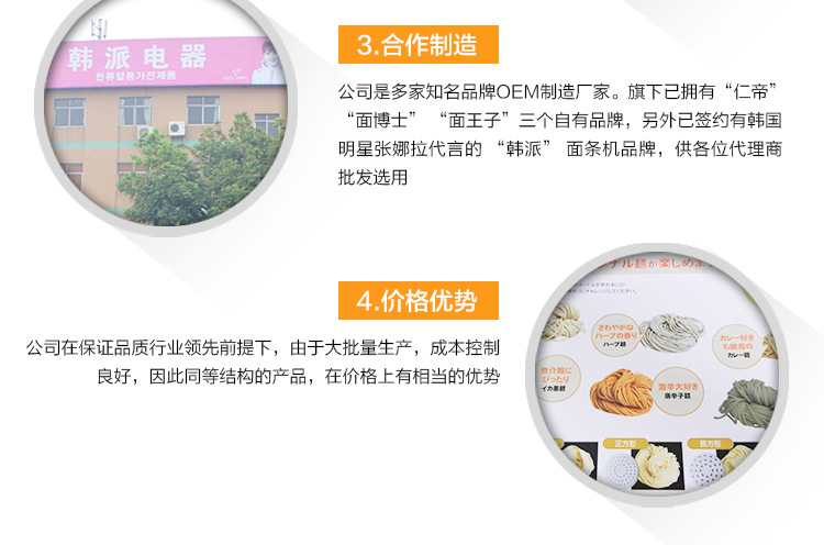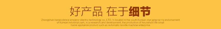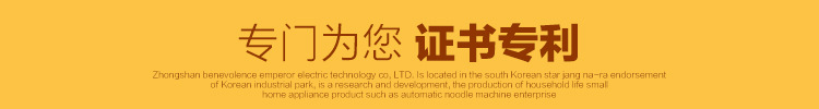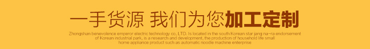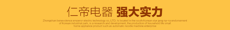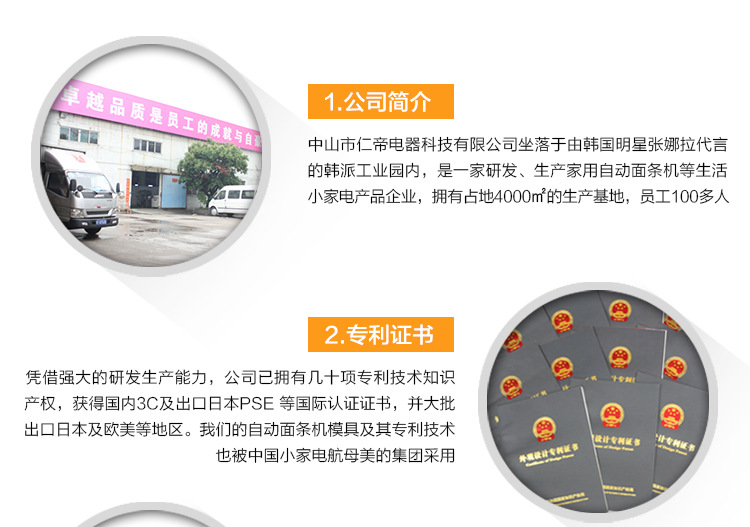 中山市仁帝电器科技有限公司由韩国明星张娜拉代言坐落3C工业园区。它是一家开发和生产家用自动面条机等小型家电的企业。它的生产基地占地4000平方米,拥有100多名职工。人们。公司具有有力的研发和生产能力,拥有数十项专利技术知识产权(见图),获取了国内PSE和出口日本自动面条机模具(见图)等国际认证证书,并大量出口。日本(参考相片)和欧美等区域。我们的OEM及其专利技术也被中国小家电航母美的集团使用(见图)。该公司是许多闻名品牌面博士的制造商。它拥有“仁帝”,“韩派”和“面王子”三个自有品牌。此外,它还与韩国明星张娜拉背书为批发商签定了“汉派”面条制造商品牌。选修的。在确保质量,领先行业的前提下,公司具有批量生产和不错的成本控制能力,因此构造相同的产品在价钱上具有相当大的优势!