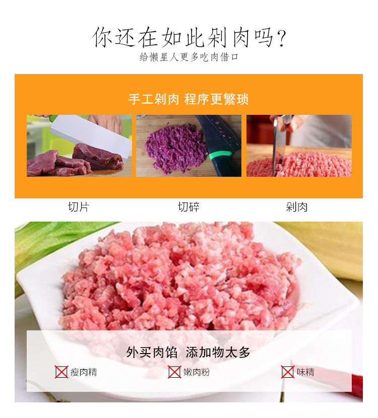 4.可以将肉分离绞碎,将肉馅切碎,饺子,彩色面条轻松切碎;
