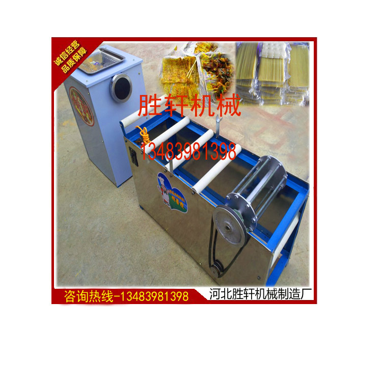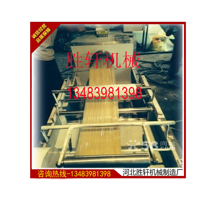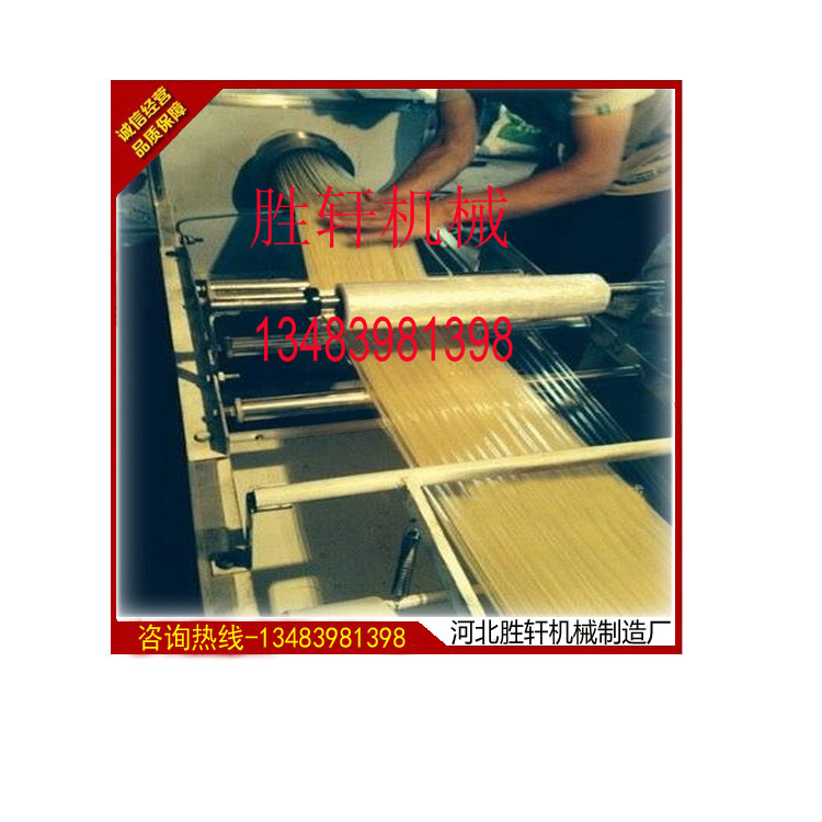6.根据所需成份先行将水摇匀,然后放入水箱中。出来后,用手将面条拉直,面条将达到8-9分钟的时间。使用方形60瓦至100瓦的风扇向上吹到外观下方以冷却面条并帮助将其摆设。完成的面条大概需8-9分钟。如果需变薄,可以减低喂食速度并减小面条数目。将其放在工作台上,根据所需尺寸切割,在中间放一张塑料片,制成制品。