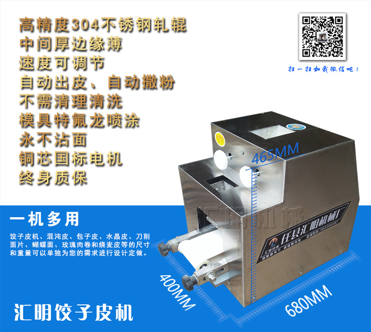 3.汇明imitation手工饺子皮包装机使用不锈钢或一般而言钢,构造合理,容易维护,拆除和干净。自动送皮,自动撒粉,自动成型,自动脱皮。卷取,均匀送料,严整的面板,节约劳力。
