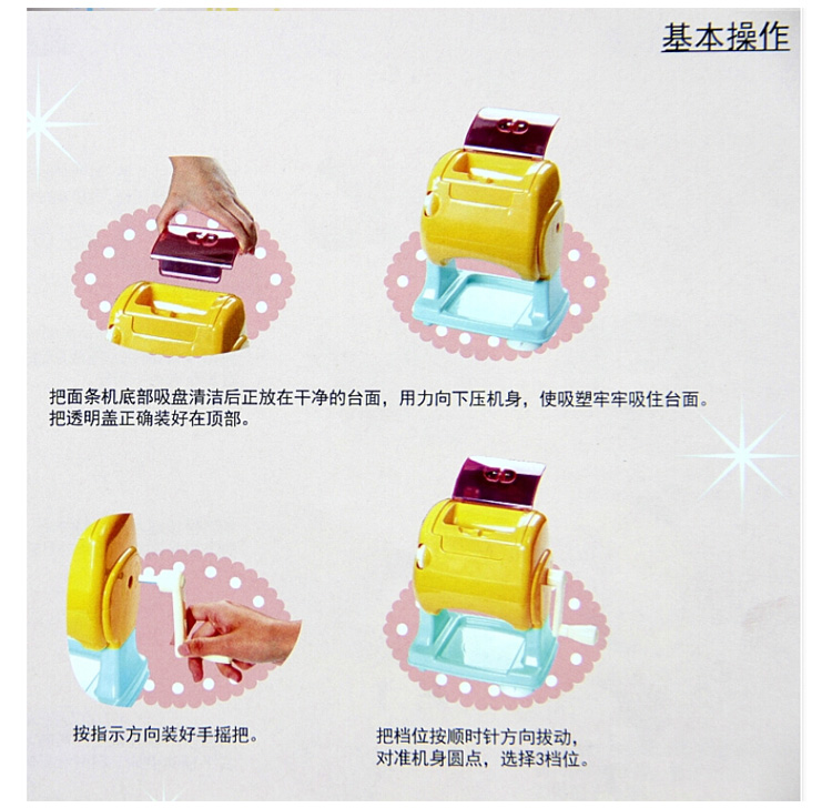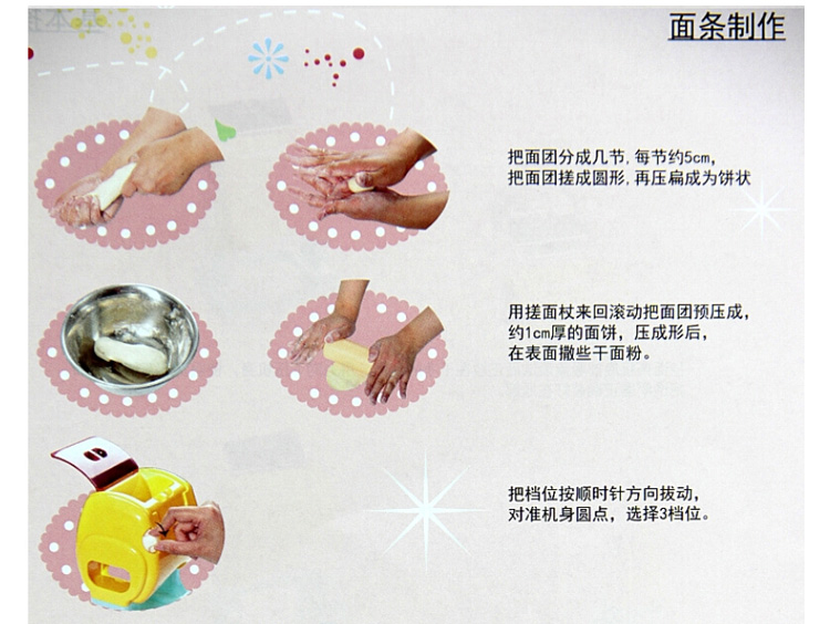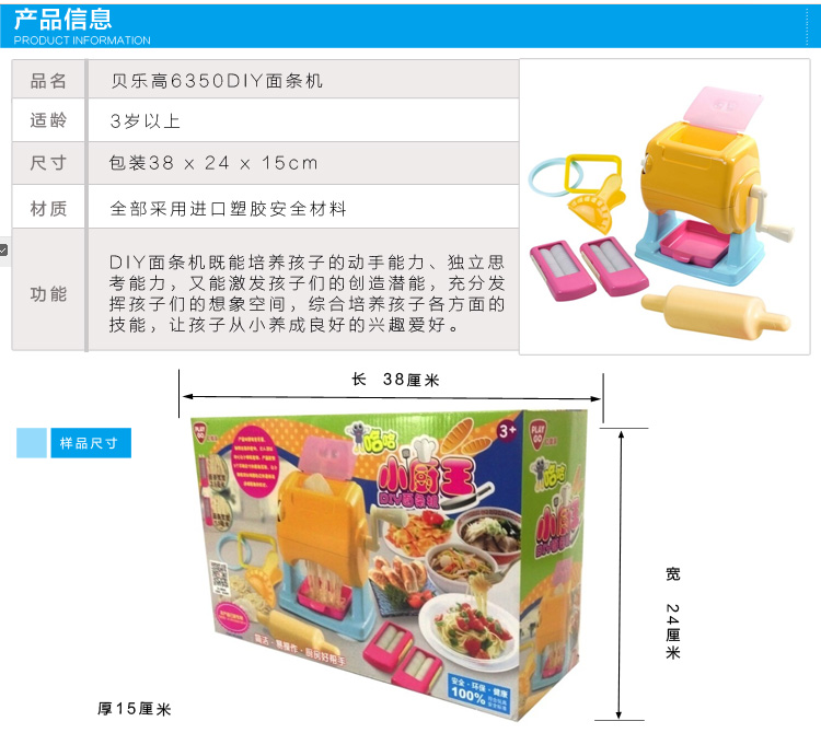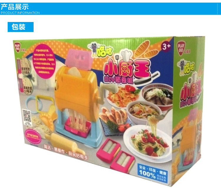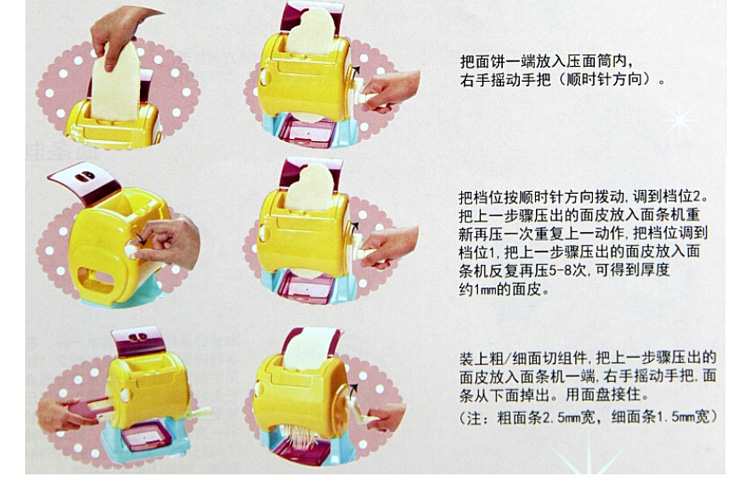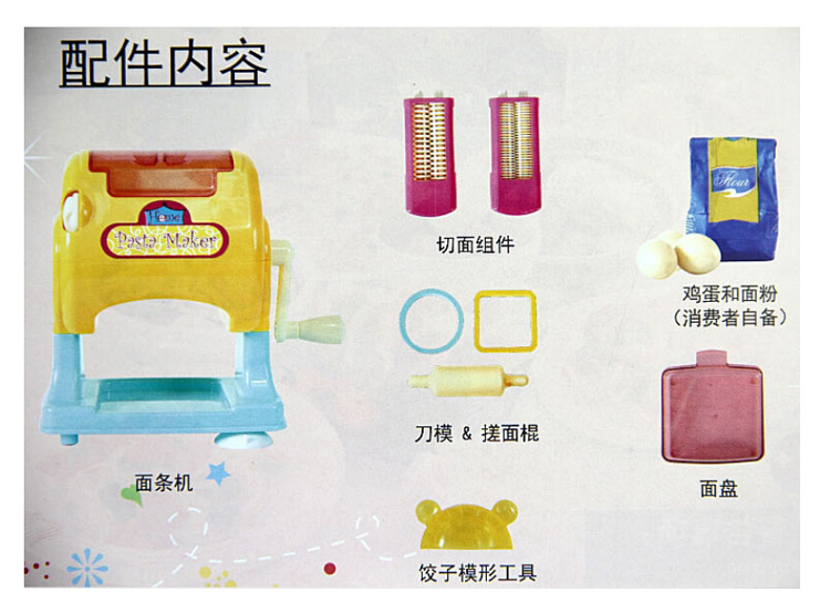 产品详情:该产品配有面条机,a面杖,两个面条模具(宽度分别为25mm和15mm),两个面团模具和一个饺子工具。制作面条后,可以用到方形面团模具打印一块面团,选取所需宽度的面条并将其放入面条机中,将面团放入面条机中,握手,然后面条就会从下面露出来。圆形面团可以用水饺模来做饺子。产品材质安全无毒,全部使用新进口原材料制成,相符国家标准,配制食品,成人可以放心让孩子们食用。让孩子们参与制作食品的过程,让他们感受制作和分享的乐趣。
