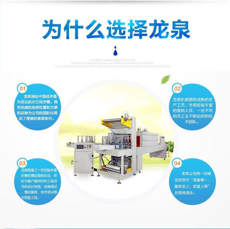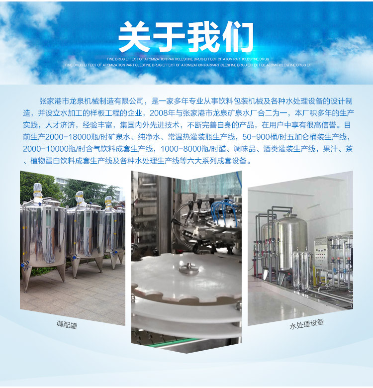 张家港市龙泉机械制造有限公司是一家从事饮料包装机器和各种水处理装置设计和制造多年的企业,并成立了水处理样板项目。在2008年,它与张家港市龙泉矿泉水厂合二成为一人。工厂积聚了多年的经验。生产实践,丰沛的英才,丰沛的经验,融为一体国内外先进技术,不停健全自己的产品,在用户中拥有很高的声望。目前,该公司生产2000-20000瓶/小时的矿泉水,纯净水,一般而言水。高温热灌装瓶生产线,50-1800桶/小时的五加仑桶生产线,2000-10000瓶/小时的含气饮料生产线,1000-8000瓶/醋,佐料,葡萄酒等六套成套设备灌装生产线,果汁,茶,植物蛋白饮料成套生产线和各种水处理生产线。产品早熟,质量高。它们不仅在国内销售,而且还出口到十多个国家,例如俄罗斯,越南,新加坡,加拿大,澳大利亚,马来西亚等,受用户好评。这是我们企业满足客户需要的最高目标。在为客户提供饮料工程项目的设计与制造,安装和调试,售后服务,技术培训等@@@的同时,它还可以提供饮料生产项目的构建或更新。扩张,在过程格局,工程支持,预算等方面提供全方位的咨询服务。