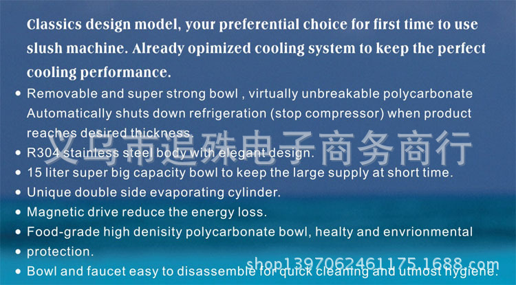 1.精细的设计,操作简便,冷却速度快,功耗低,最适宜制作果汁,豆浆,椰奶等冷饮产品;