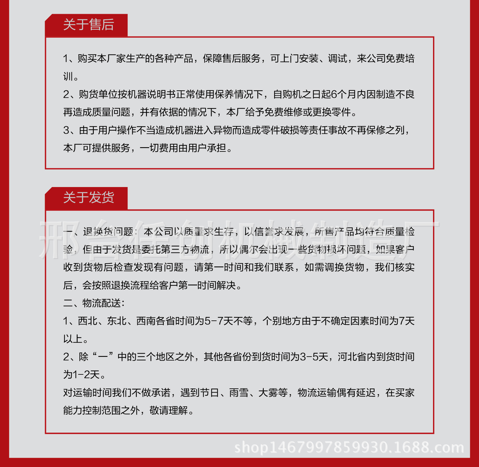 2,设备质量施行“三包”,设备免费保修一年,免费代办托运,长期跟踪服务。