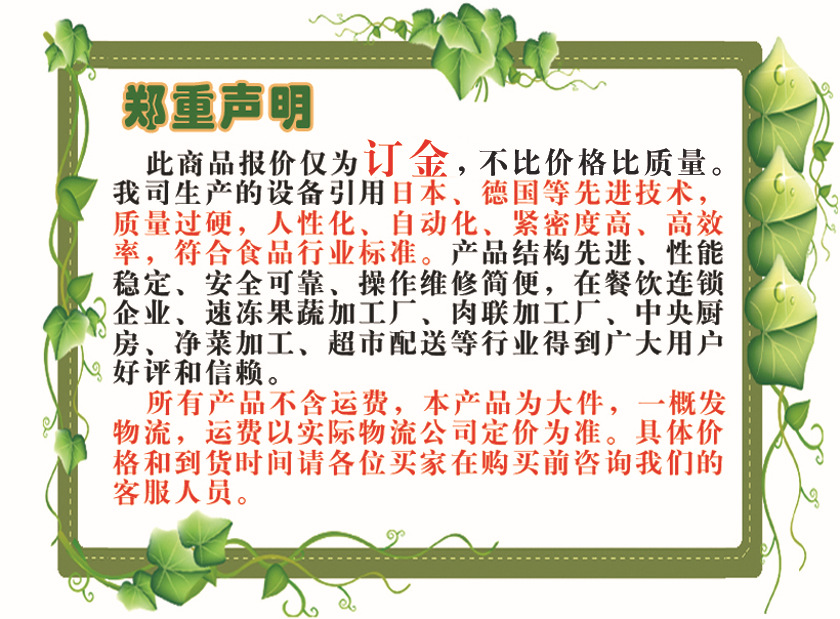 - 适用范围肉制品加工厂设备,冷冻食品厂设备,休闲食品厂设备,中餐店设备,西餐店设备,中央厨房、净菜配送、速冻食品加工厂等加工并可配合自动化生产线