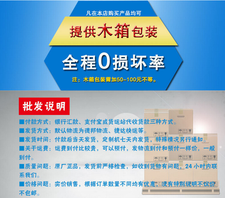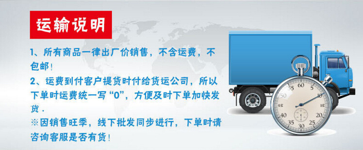 1.关于运费:本店货品价位不涵盖任何运费税,均为机器出厂价格。由于送货方法不同,送货地点不同,所以一般而言物流和快递的价位交货方法不同,到各地的运费也不同,因此本店将根据购买者的送货方法和收货地点确定运费,以确保最后交易价位。