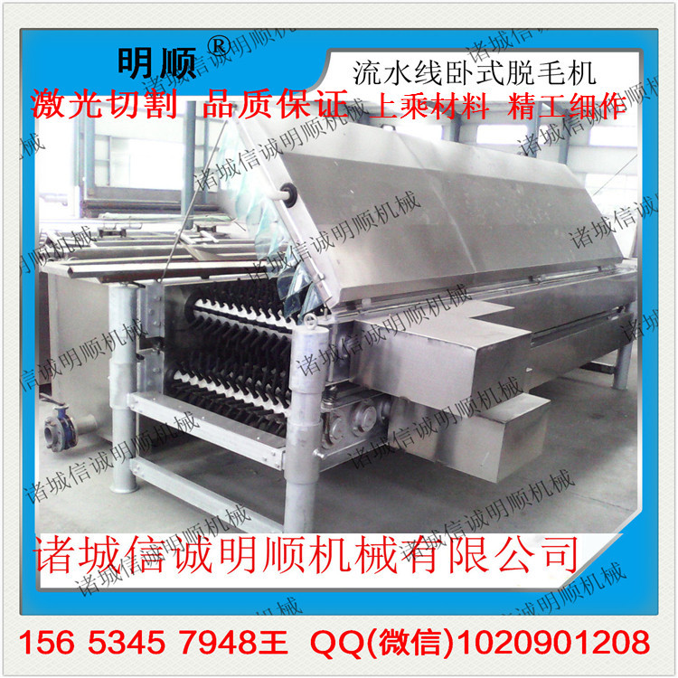 该设备为肉鸡,鸭,鹅等另一种主要的脱毛工作设备,其为卧式转辊构造。使用链传动使脱毛辊的上排和下排实现相对旋转,从而除去了可以调节上下两排脱毛辊之间的间隔,以满足不同鸡鸭的需要。