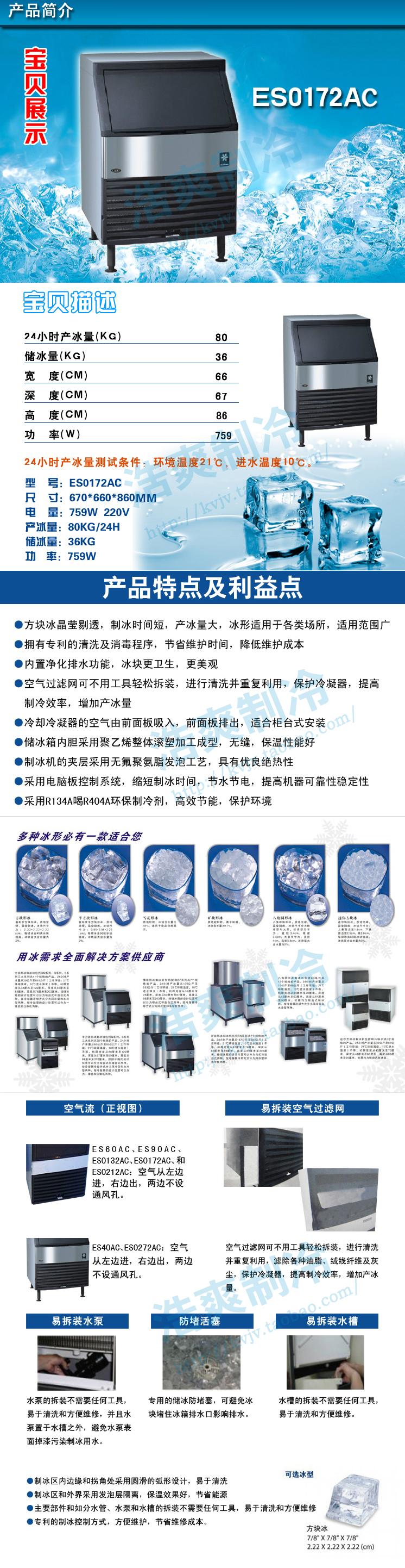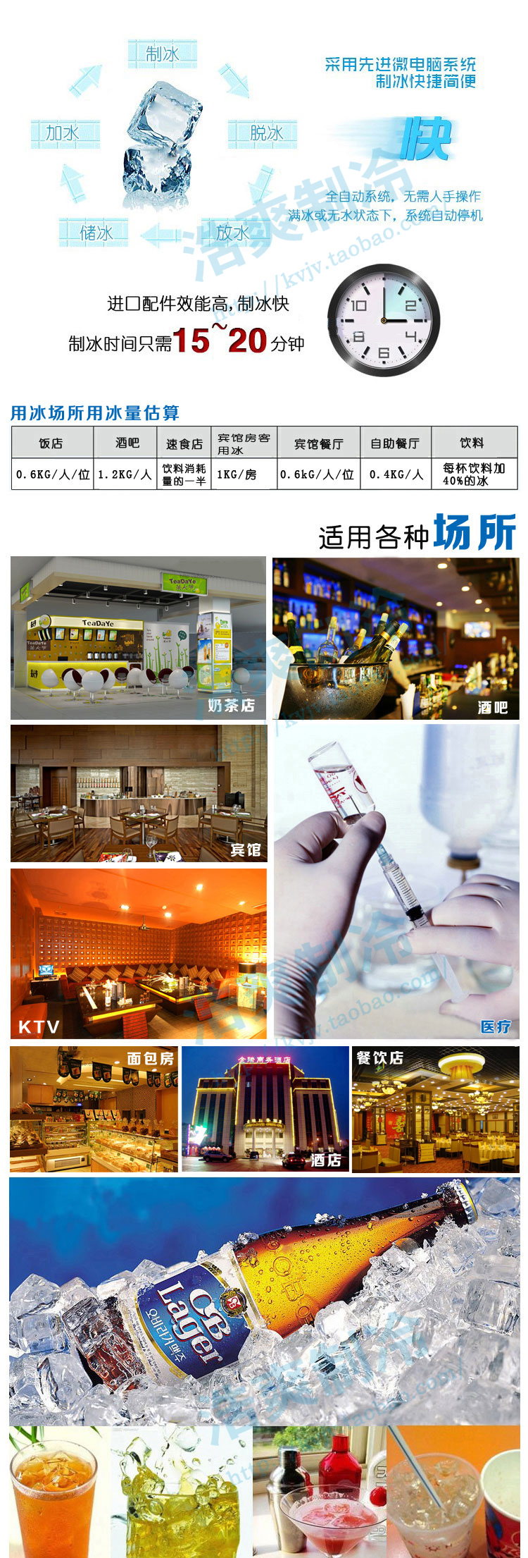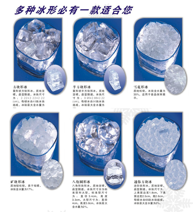 *冰块晶莹剔透,制冰时间短,制冰量大,冰块形状适合各种场地,适用范围广。