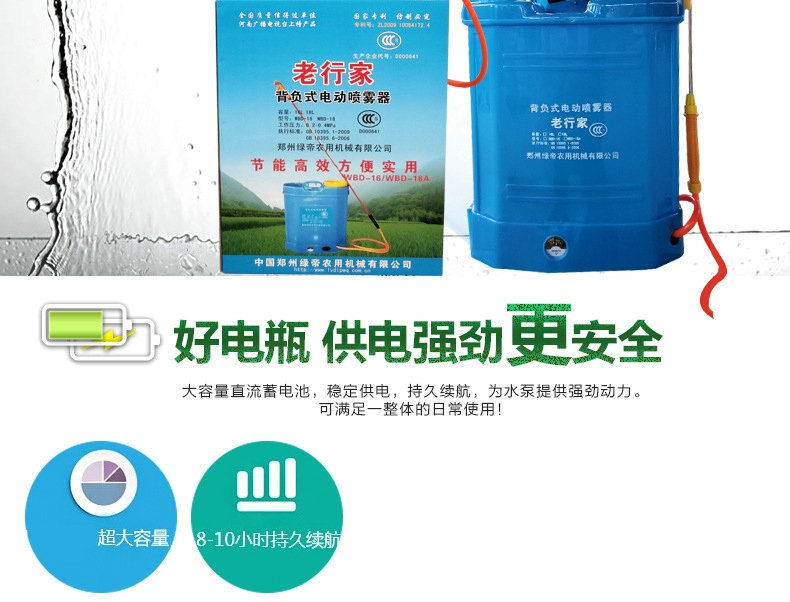 2.电池容量大,工作时间长:一次充电,可以喷洒约30桶药品,中午再加药2-3小时,也可以喷10-16桶药品。