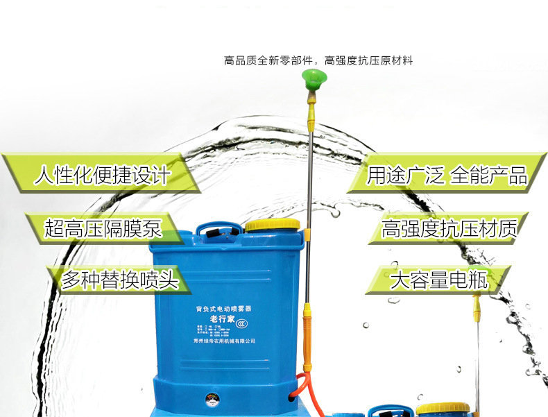 电动喷雾器是我们公司开发的下一代高科技产品。它克服了平常手动喷雾器和其他制造商电动喷雾器的许多缺陷。它具备高压,雾化好,效率高,成本低,不必维护,机械寿命长等优点,是喷雾器的理想替代产品。