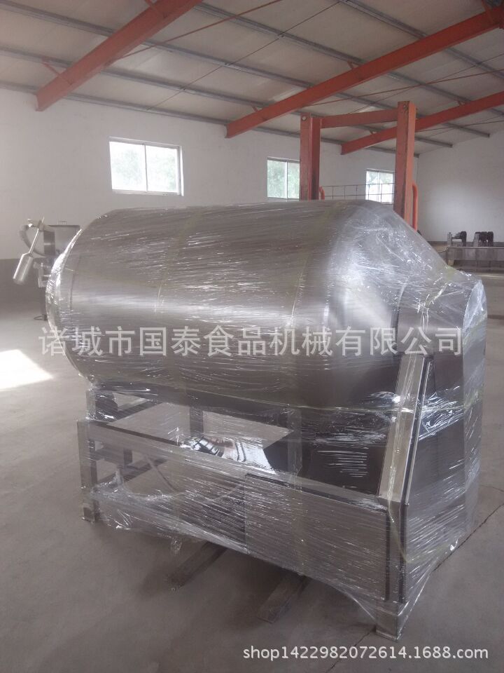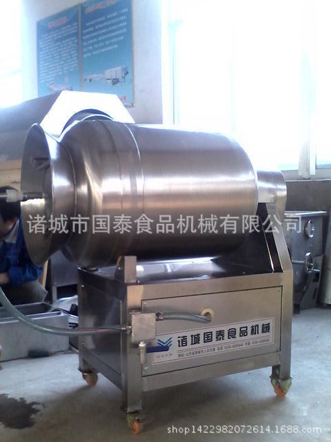 真空滚揉机是在真空状况下运用物理撞击的法则,使捏合物在滚筒中上下滚动,互相撞击并互相殴打,以达到按摩腌渍的目的,快要其均匀地揉捏到吸收腌渍,提高肉的结合力和产品的弹性;该机器具肺脏呼吸机能,可使产品在滚筒中膨胀,缩减往复运动,改善肉组织的结构,提高切割效果,并提高产量,可加强保水能力并改善产品的内部结构产品。
