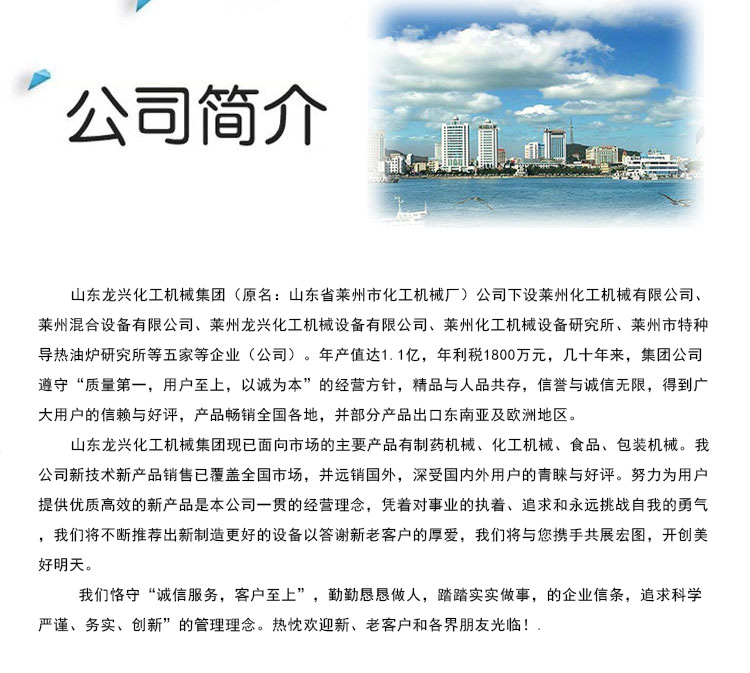 山东龙兴集团主要产品:化学机器,化学设备,搅拌机,捏合机,导热油炉,导热油锅炉,有机热载体炉,反应釜,反应罐,反应罐,砂磨机,研磨机,分散机,球磨机,胶体工厂,三辊机,三辊研磨机,四辊机,搅拌机,乳化机,过滤器,完整的化学设备,压力器皿,非标准设备。