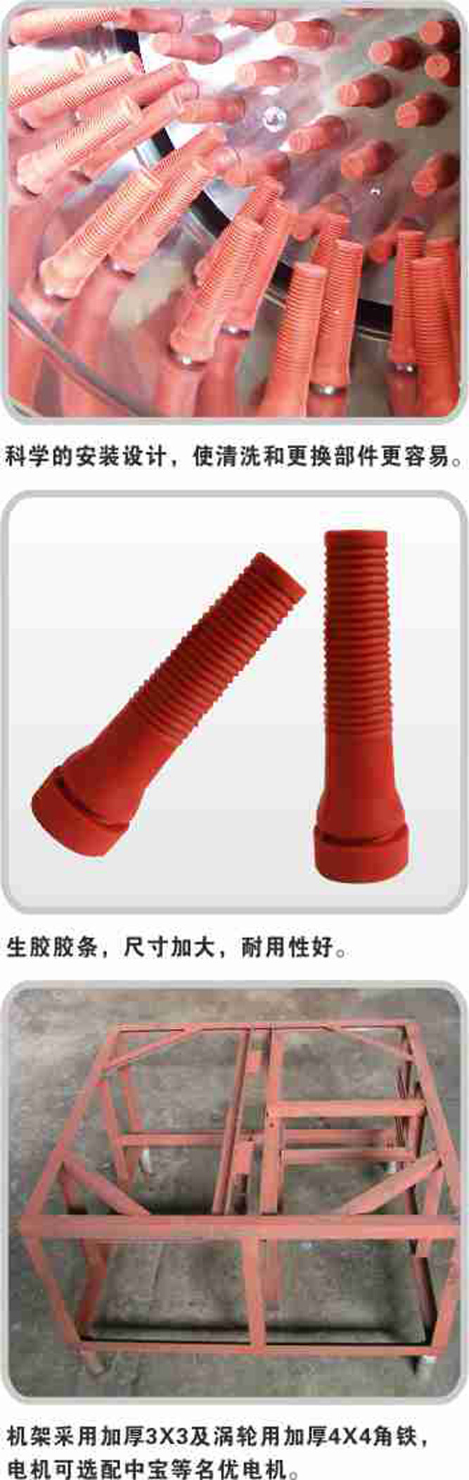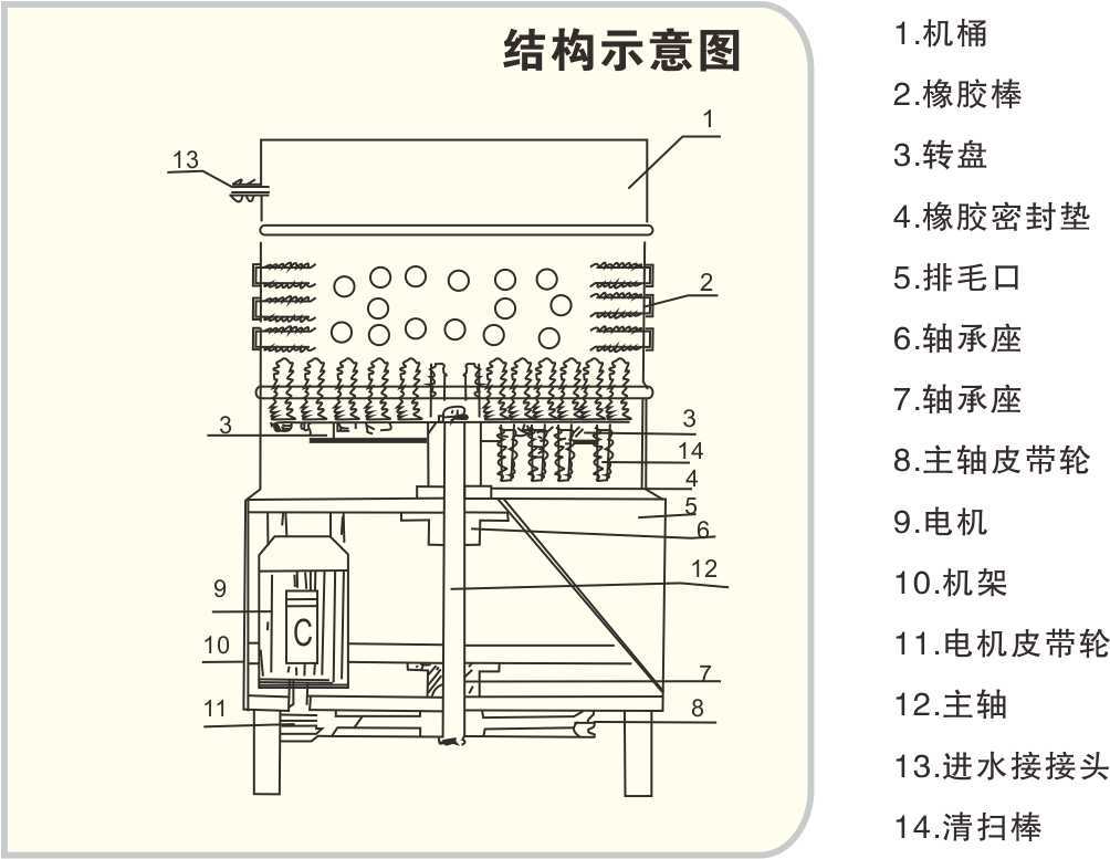 用65-80°的开水均匀地煮熟宰杀的鸡,鸭和鹅,然后打开机器并将其放入桶中(江,马铃薯,鱼可以直接放进来)。约十秒钟,打开用水龙头将鸡毛或姜皮冲洗掉,等一会儿再将其取出。鸡毛一般而言只需半分钟洁净一次,其他时间则稍长一些。