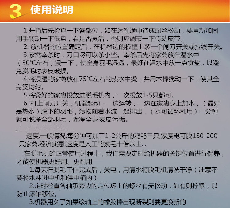 4.如果橡胶杆长时间损坏或折断,应立即更换,以保证正常的工作效率。(在使用过程中,将鸡鸭用温水烫烫后,放入机器中,并在机器中加入一些温水,胶棒不会那么易于破裂)