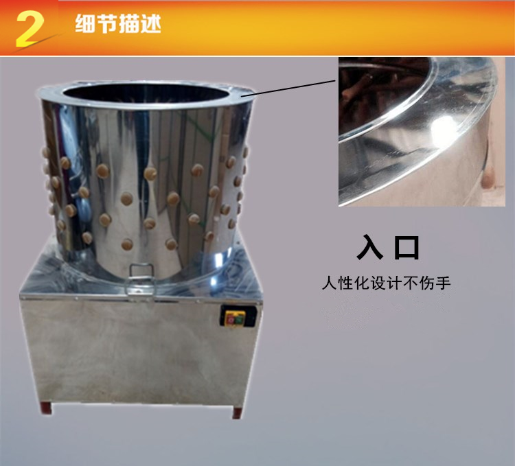 产品详情:脱毛机,用以屠宰后的鸡,鸭,鹅和自动脱毛。它可以一次除去羽毛,细毛,脚,爪和污垢。它也可以用以扫除姜皮,脱马铃薯皮和其他农产品。使您免受繁琐繁琐的体力劳动。本机操作简便,省力,省时,工作效率相当于十多人的体力劳动。旅店,饭堂和农产品加工家庭对此高度称许。