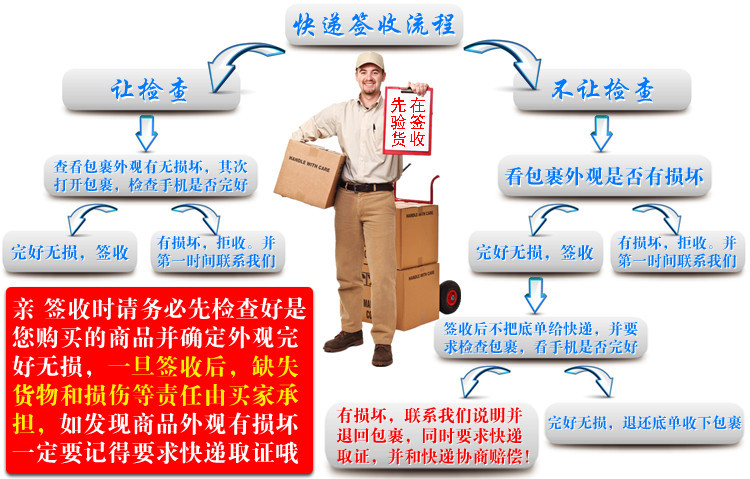 签收时,请在运输人员面前,开启包装检查货物是否毁坏,并检查数量是否正确。如果发现任何问题,您将回绝签名,或者,如果有问题,您须要作为快递与我们联系。签署后,工作人员将离去。出现问题后,买方应承担义务。为了使买卖双方交易愉悦,请不能不执行!谢谢!签收收据后即视为已认定。