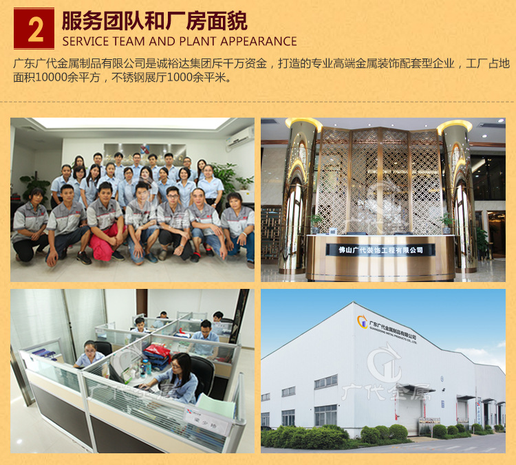 广东广代金属制品有限公司是诚裕达集团费用了数千万财力确立了专业的高端金属装饰配套企业,工厂