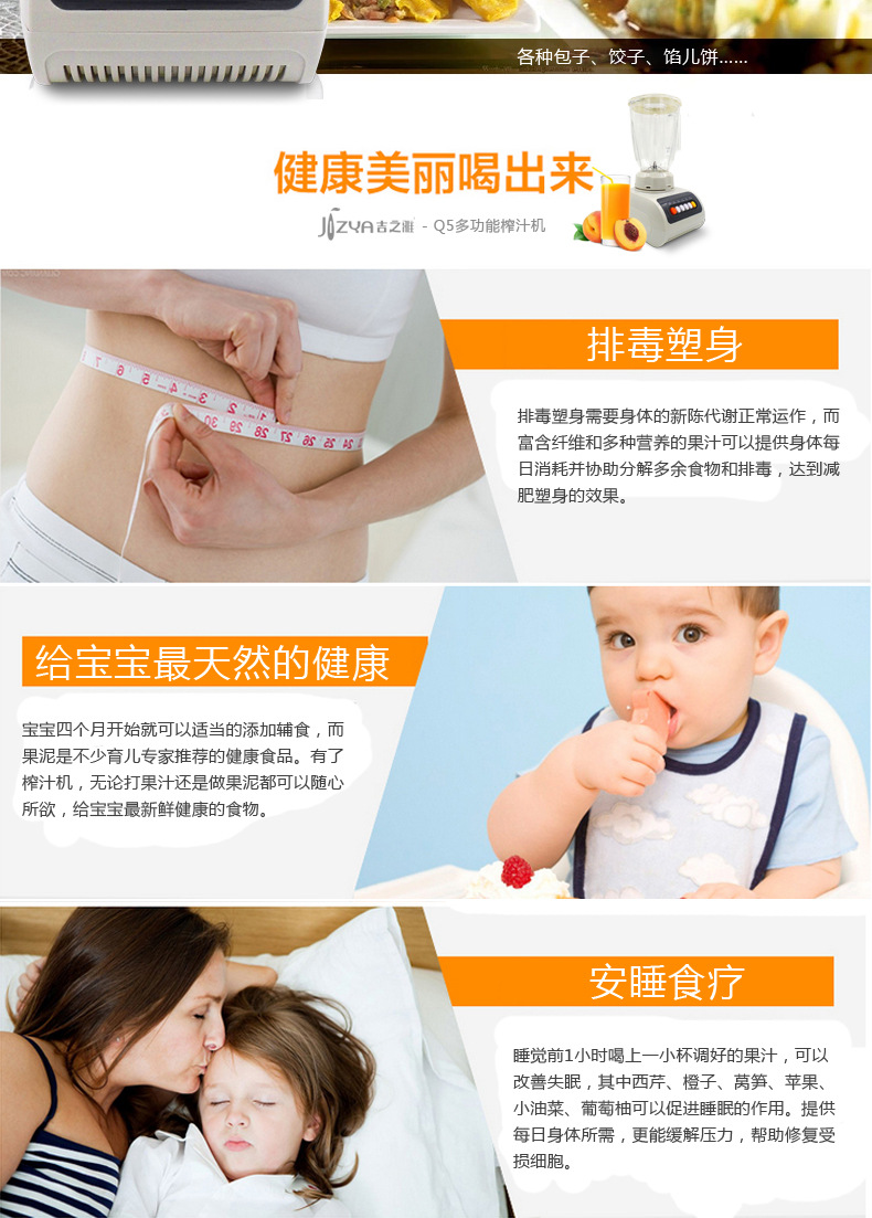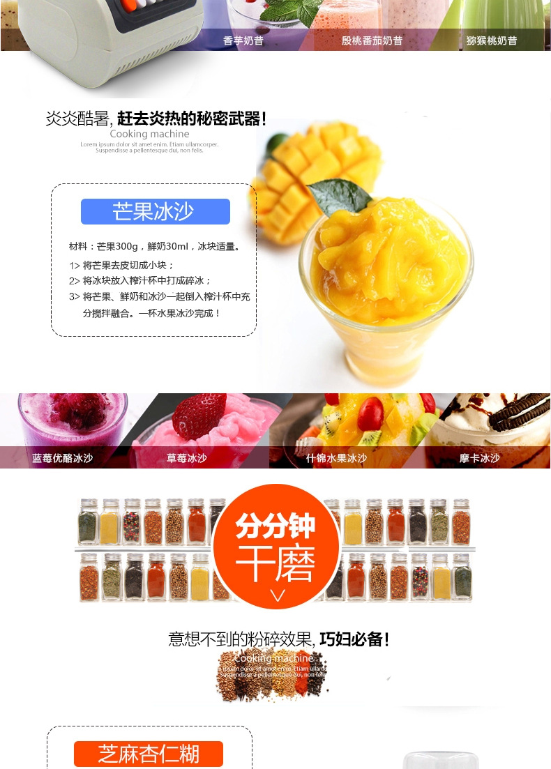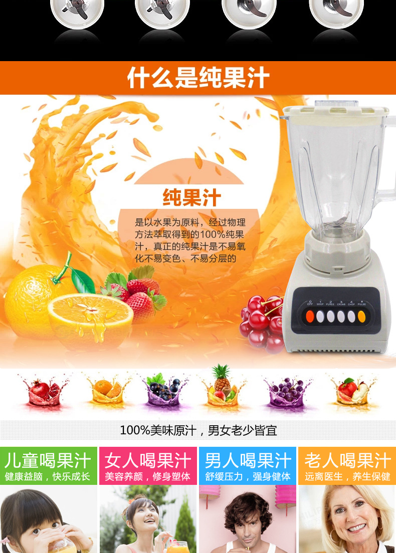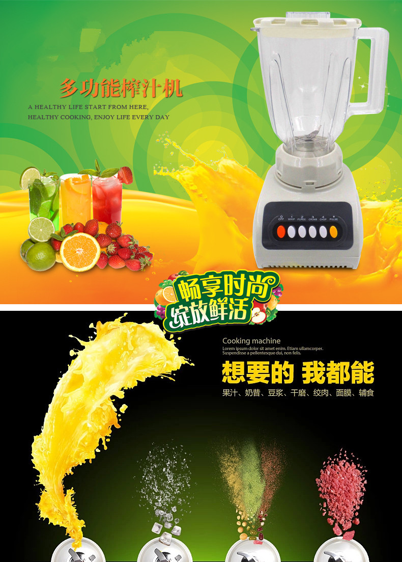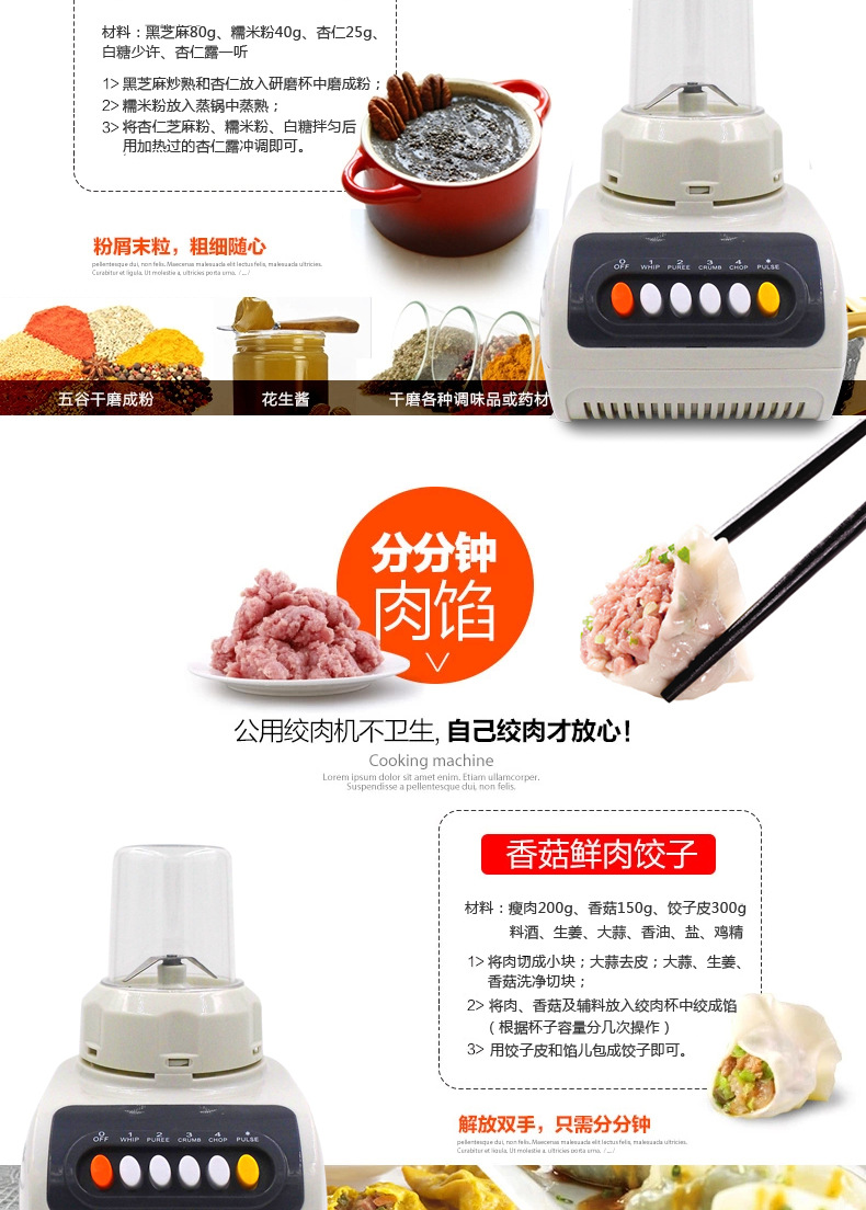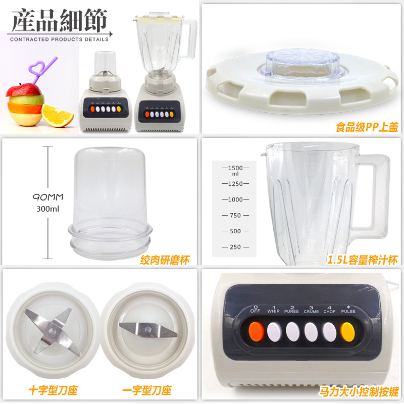- 榨汁机附加功能榨汁,打蛋,干磨,碎冰,碎肉,和面