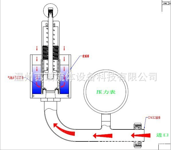 通过调节弹簧和锁紧螺母的调节盖,将卫生安全阀调节到特定压力。校准压力是为避免毁坏管道设备而设立的最大安全压力值。当管道压力大于安全阀校准压力时,阀座会自动弹起,并获释管道系统中的压力以保护管道和设备。