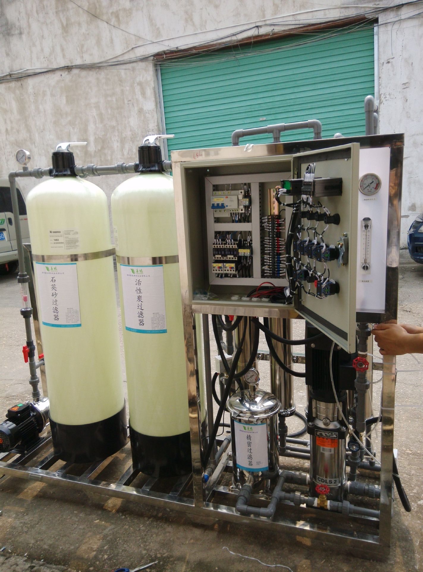原水-原水箱-原水泵-@@@@(多介质过滤器)---石英砂过滤器---软水器---精细过滤器(内置活性炭过滤器)---高压泵---PP滤芯---紫外线杀菌----水位