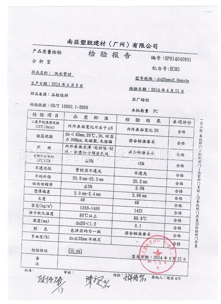 无铅管道检验证书: