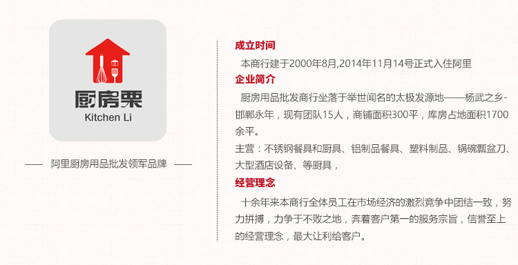 厨具批发商座落闻名的太极拳诞生地-杨武之乡-邯郸永年。该公司成立于2000年8月,占地面积300平方米,现有团队15人,库房面积1,700余平,十多年来,该公司的全体职工团结。在剧烈的市场经济竞争中,尽力努力,立于不败之地,遵行客户至上的服务主旨,声誉至上的经营理念,为客户带来最大的盈利。