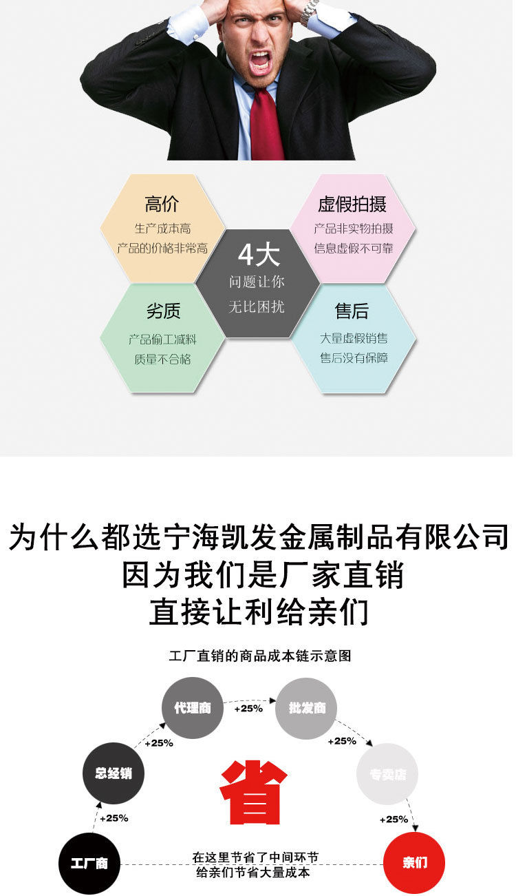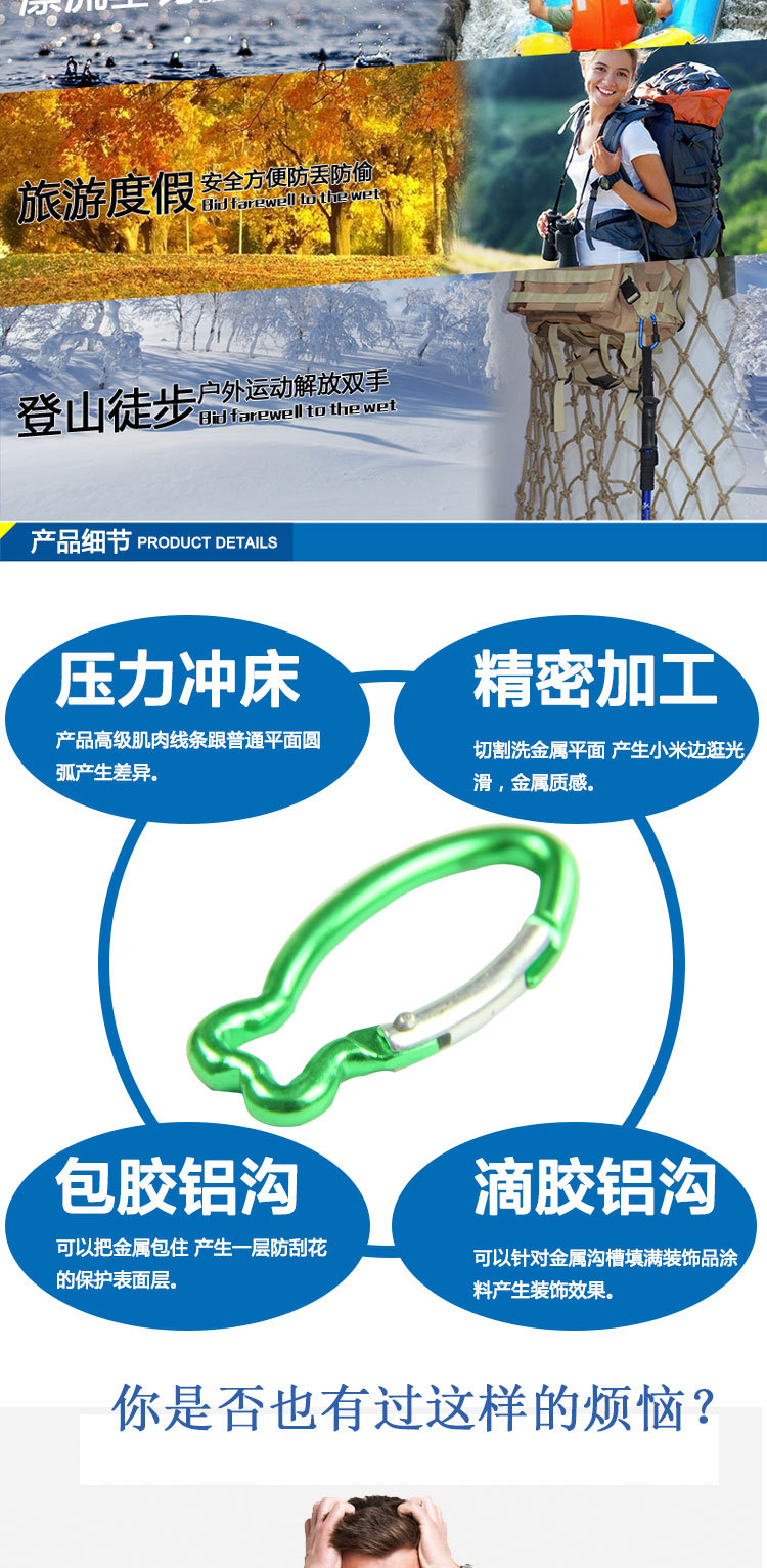 产品详情:我厂坐落宁波市宁海县,是一家高质量,高效率,高科技的现代化生产型工厂,厂房装置齐备,技术力量充裕。经过十六年的发展,它早就享有许多分公司和车间。该工厂主要生产铝产品,现在开发和生产各种登山扣,钥匙扣和开瓶器。本厂严守“声誉第一,客户至上”的主旨,重合同,守信用,在国内外客户中拥有不错的声名。本着平等互利的规范,我们热情欢迎国内外各界人士与我们联络。探讨协作,加强友情。