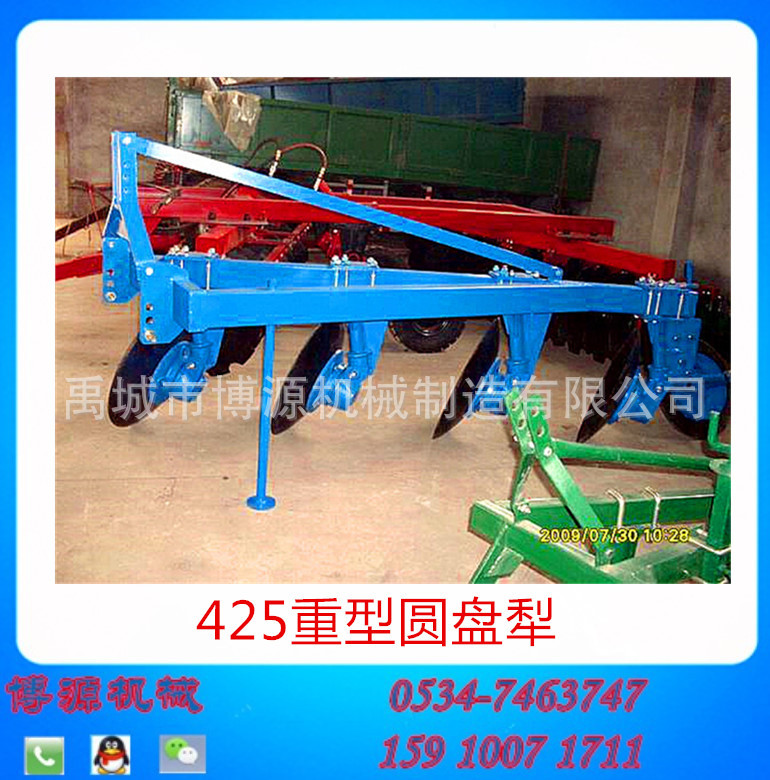 圆盘犁适用于旱作区早熟耕地或荒地的耕作,特别是高产绿肥田和稻麦茬的后田的耕作和耕作。翻土质量能满足农业生产的技术要求,抗耕性低,操作调整简便。