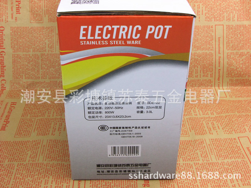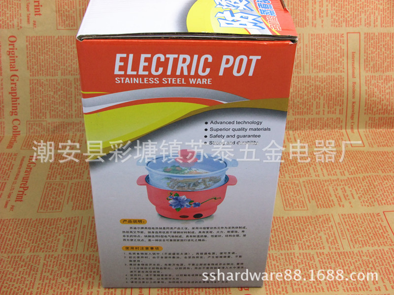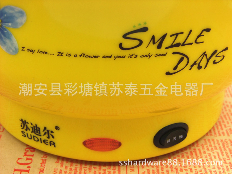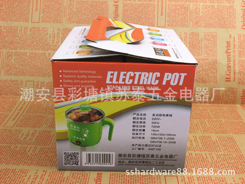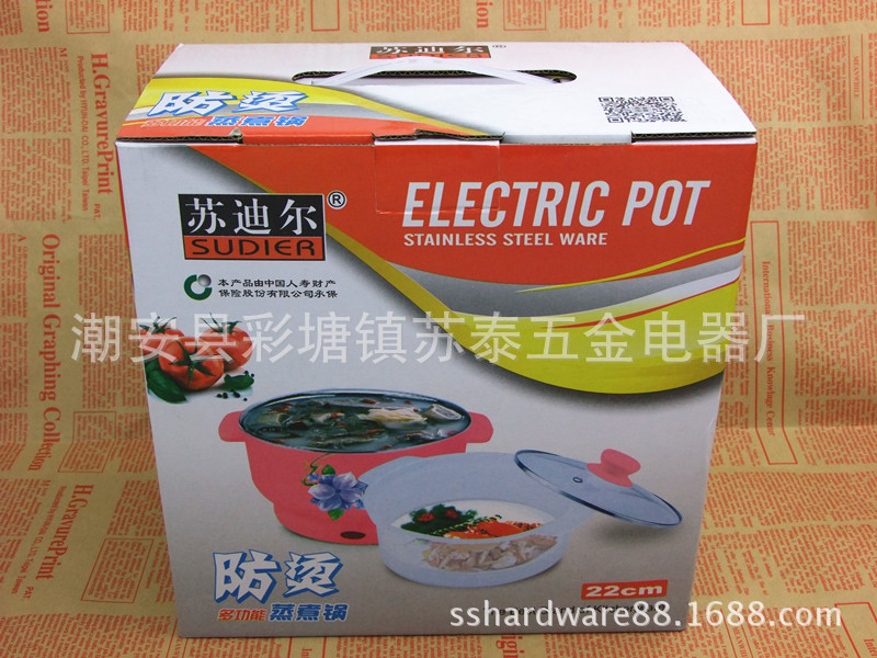 产品详情:潮安县彩塘镇苏泰五金电器厂座落广东潮安县彩塘镇,被称作“不锈钢帝国”,交通方便。专业生产不锈钢厨具,电热水壶,电蒸锅,电饭锅,电热杯,五金塑料配件及其他厨房餐具产品。同时,我们为国内外一些广为人知品牌提供OEM贴牌不锈钢生活用品生产服务。产品受客户和消费者好评。苏泰产品已在世界十多个国家和地区销售。