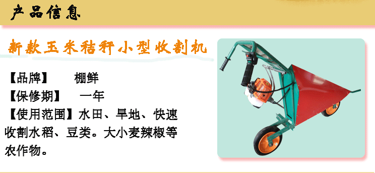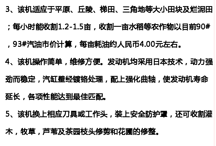 3,本机适用于冲积平原,丘陵,梯田,三角形等大大小小的原野和泥田;按照目前90#,93#汽油的市场价格,每亩每小时可收1.2-1.5亩农田,可收一亩稻米等农作物,每亩油耗约为人民币4.00元。