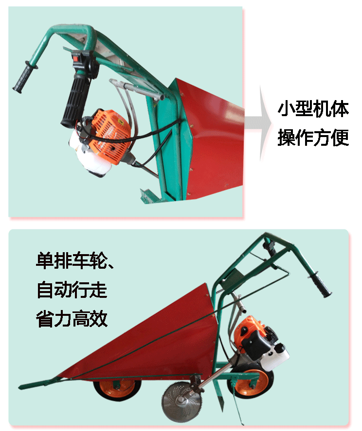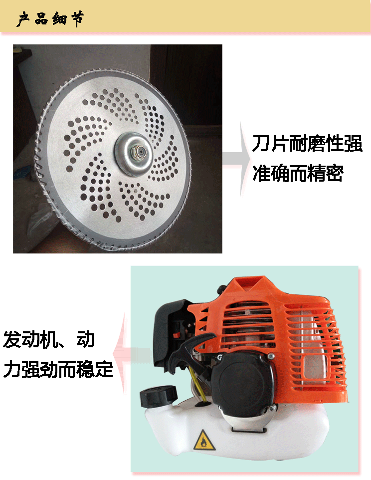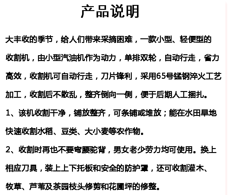 2.收割时切勿弯腰驼背,男女老少均可用到。更换相应的刀具,安装上下托盘和安全防护罩,还可以收割灌木,牧场,芦苇和茶园支系并修剪花圃坪。