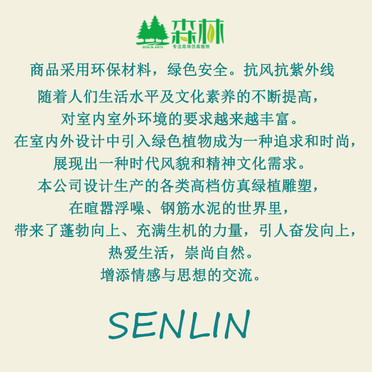 东莞市企石森林工艺品厂是集规划,设计,生产,生产,安装于一体的一站式服务企业。地处广东史文化名城-东莞市的企石镇,地理位置优于,交通兴盛。工厂占地面积5,000平方米。得益于精湛的生产技术,它早就是中国最先进的人造植物制造商之一。