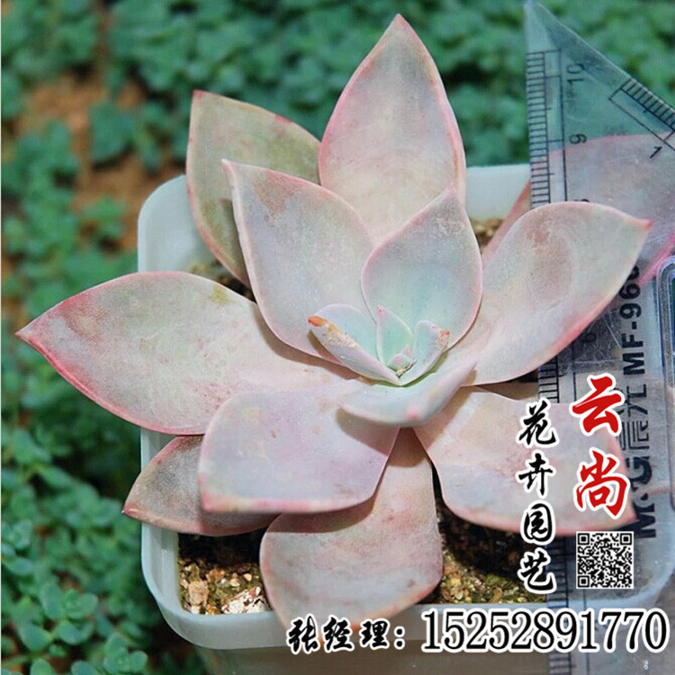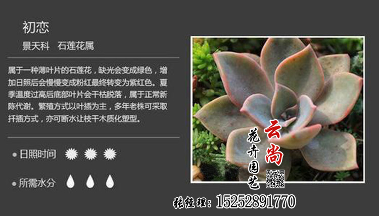 景天科拟石莲花属【初恋】Echeveria cv. Huthspinke拟石莲花属交配的种类,叶子被薄薄的白色粉末遮盖。在半日光下,叶子的中心是青绿色的。如果日光充裕,色调会很深粉红色,就像初恋中的男孩或女孩一样。通风不错的环境更耐干旱,浇水前泥土干燥。