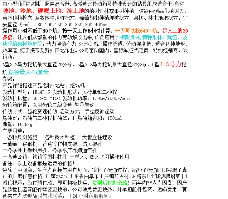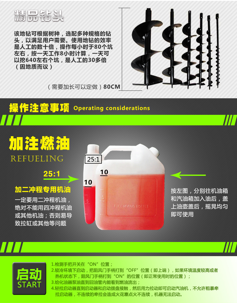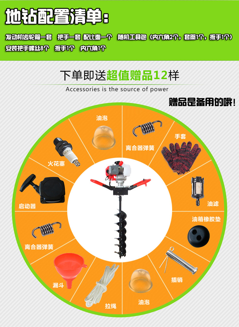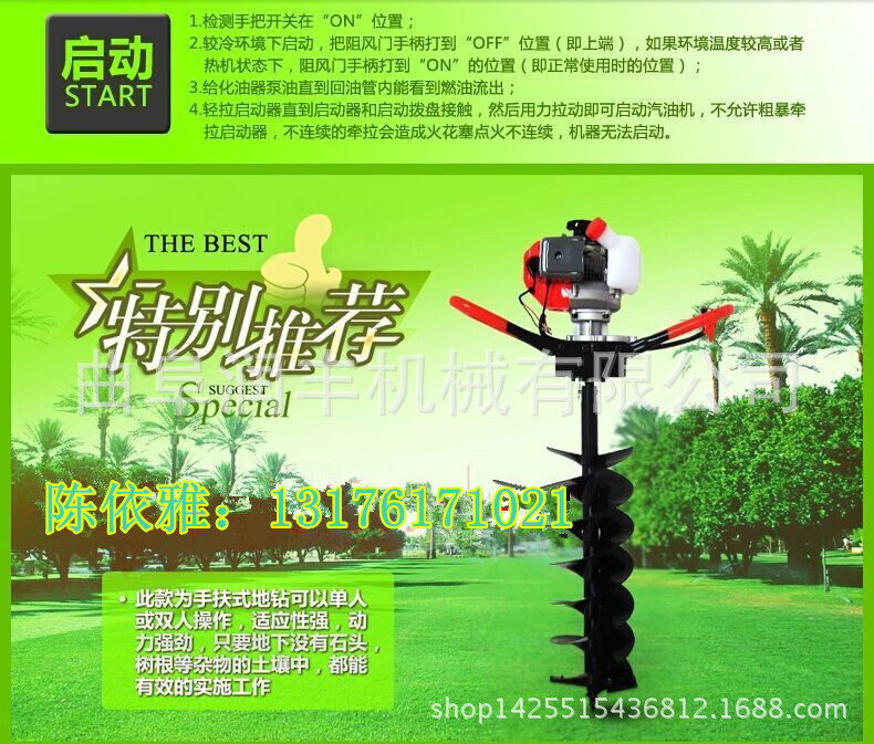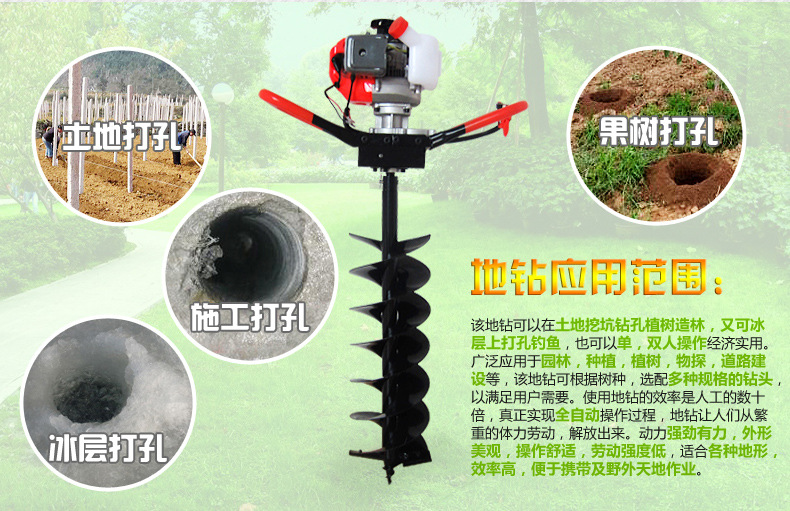地钻用以种苗挖坑,家畜围栏挖坑。葡萄种植,埋桩挖坑。在果树和森林上施肥和挖洞。您还可以用到冰钻挖冰洞和鱼类。
