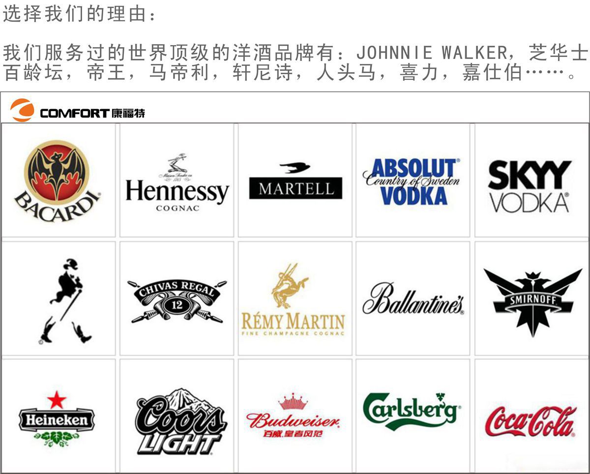 公司成立于2004年。多年来,公司秉承“创新,共赢,发展”的经营理念,本着“客户至上,质量,效益”,“四个第一(以产品推广行业第一,客户转换行业第一,服务质量行业第一,产品质量行业第一)为工作目标,下降生产成本,平稳质量,并为客户提供最具成本效益和最宣扬的产品。我们服务的全球顶级洋酒品牌包括:JOHNNIEWALKER,芝华士,ballantine,emperor,马帝利,轩尼诗,rentouma,喜力(heineken),嘉仕伯……凭借生产经验和国际闻名品牌的严苛要求,我们保证为客户提供的每一种产品都是高质量的产品。