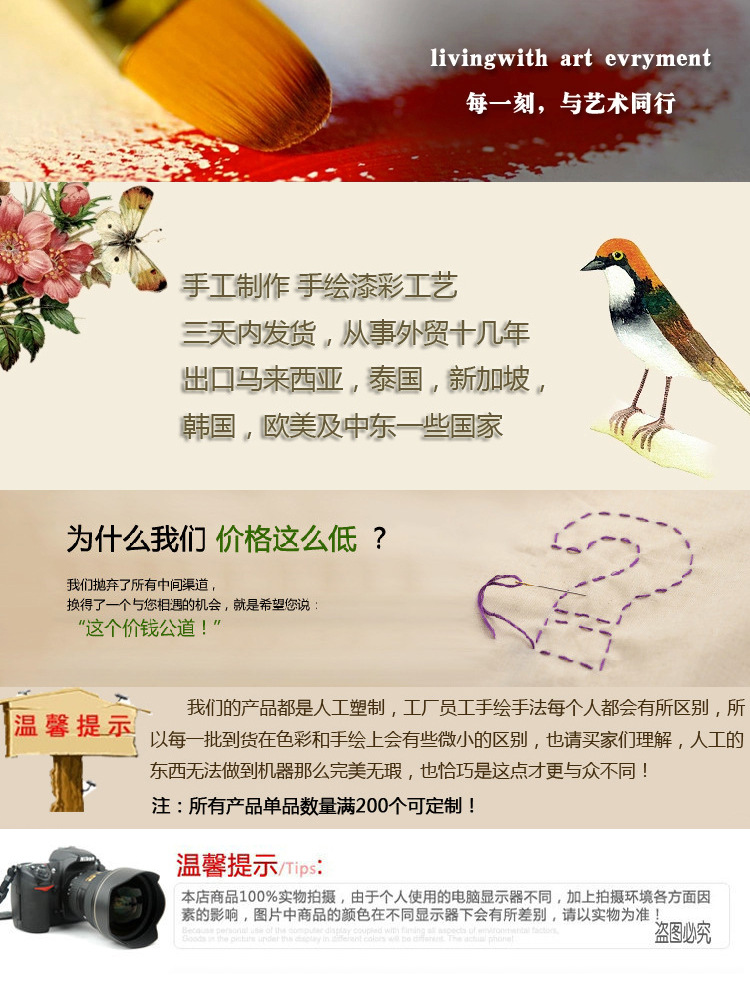 我们的陶瓷全部由人造塑料制成,工厂职工的手绘技术将因人而异。因此,每批次的货品在颜色和手绘上都会有细微的区别。请明白,人造的事情是无法完成的。机械是如此的完美无瑕,而且碰巧这是更奇特的!