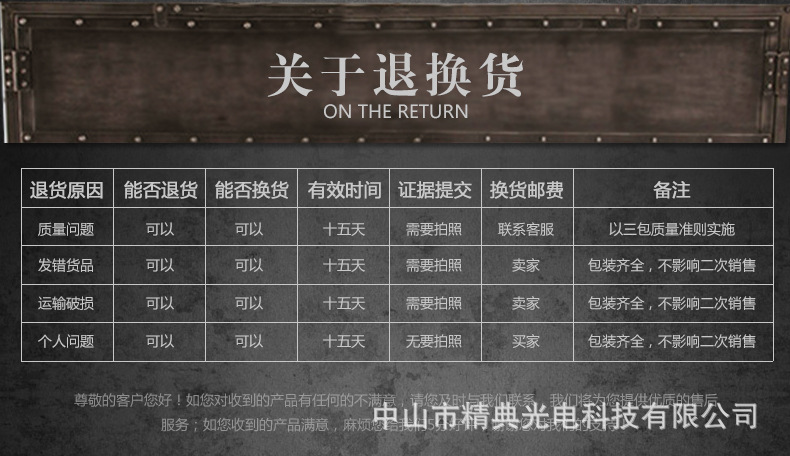 对于非我们义务引起的退货和换货,将减半包装损坏费(第二次装运后,电灯泡的包装基本上被视为废品,并且包装损坏费按价位的5%测算)并邮寄
