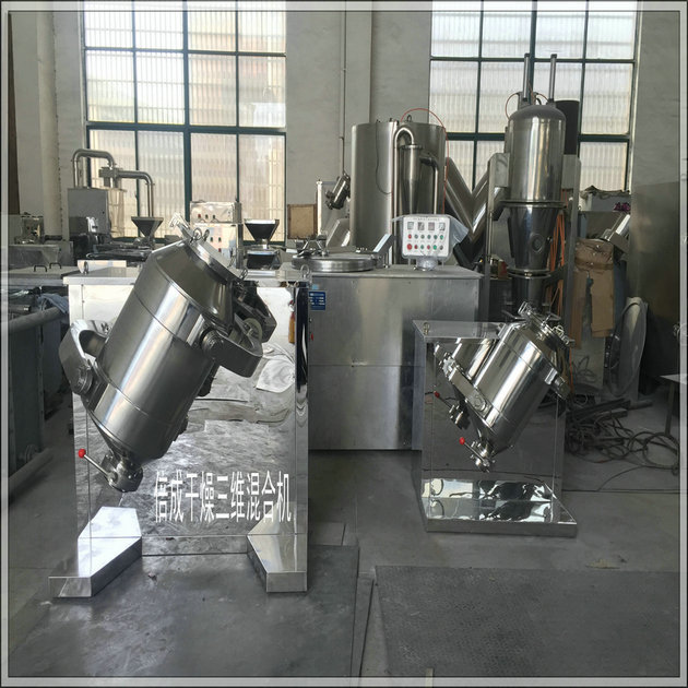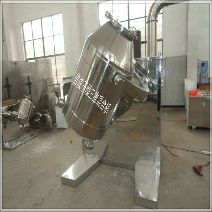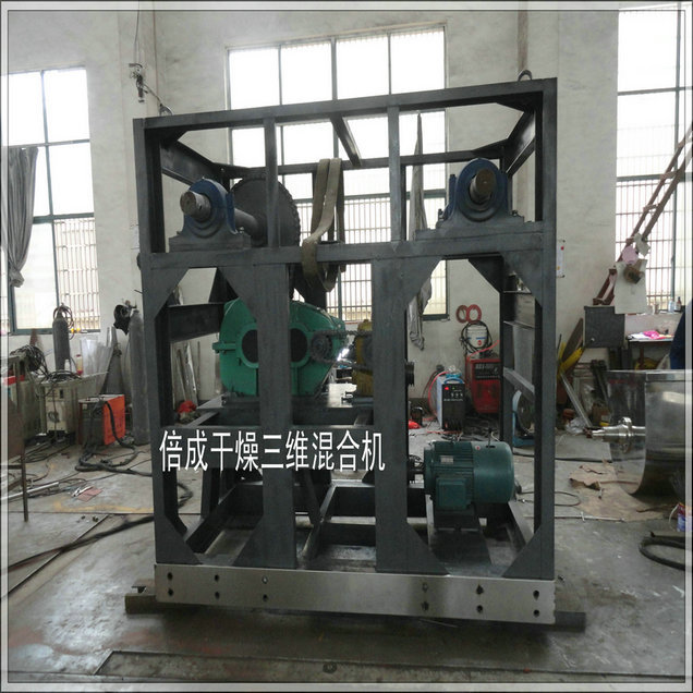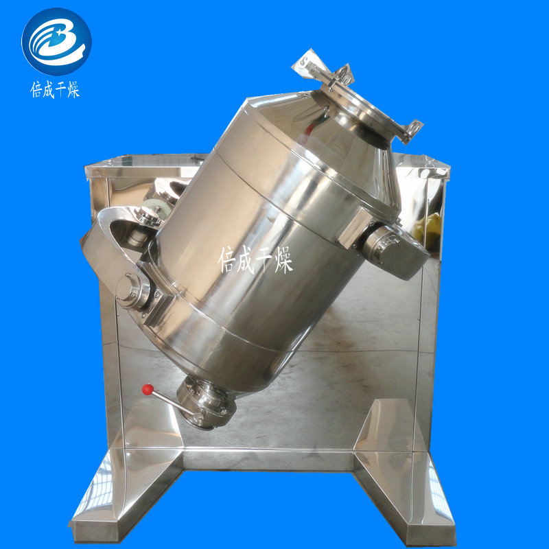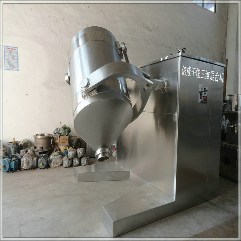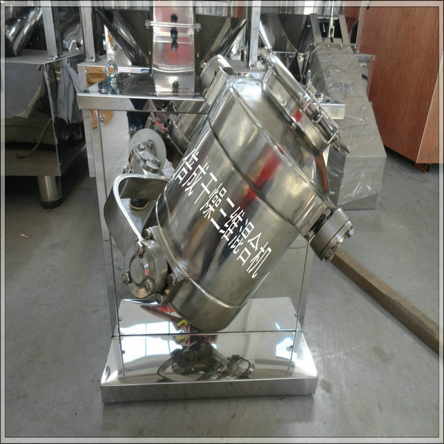 构造:机器由机座,传动系统,电气控制系统,多向运动机构,混合缸等构成。与物料直接触及的混合桶由优质不锈钢制成,内部枪管的外壁是镜面抛光的。
