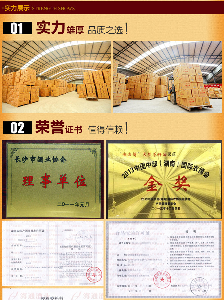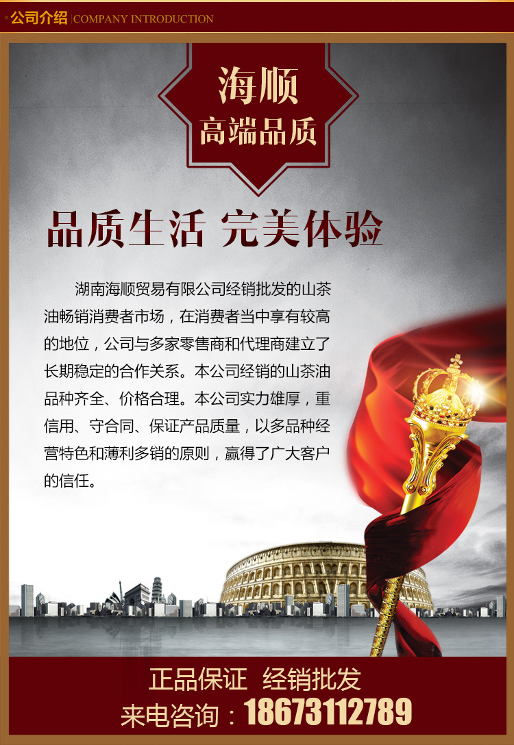 湖南海顺贸易有限公司出售的山茶油和白酒在消费市场上都很受欢迎。酒类包括:酒鬼酒,泸州老窖,郎酒,五粮液,湘泉,西凤,茅台,西九,锦江泉等。公司在顾客中保有很高的声望,早就成立了与众多零售商和代理商确立了长期平稳的合作关系。我们持有种类完备,价位合理的白酒。实力丰厚,值得信赖,信守合约,产品质量保证,具多种经营特色和薄利多销的规范,但快捷的周转,获得了客户的信赖。