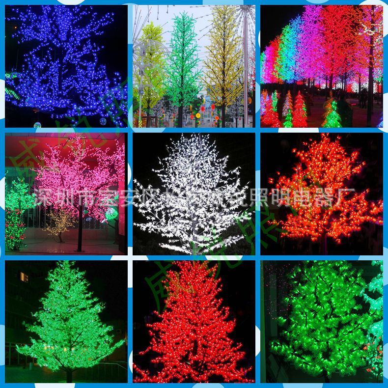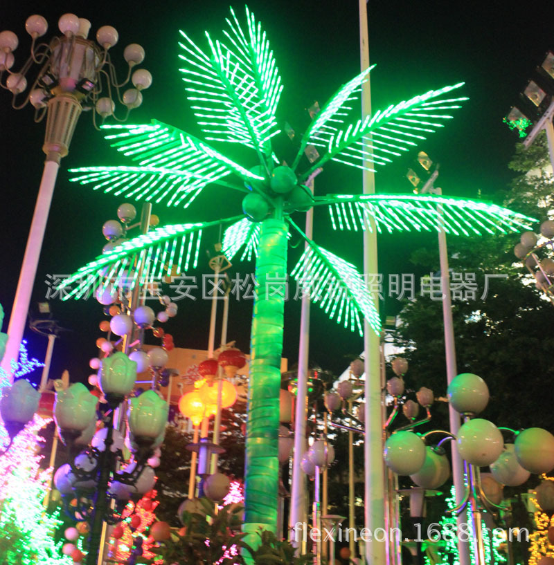 1.LED景观树一般而言由彩虹管或绑有铁框架,特定图案和产品的灯串组成