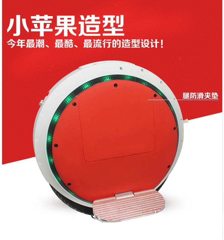 产品详情:小苹果跑马灯独轮车是该公司最新的最畅销产品之一。该产品的外部有一个环形选框,配备了智能蓝牙部分,并配备了高端喇叭,可以满足独轮车发烧友的各种酷炫时尚追求!可向微信617935286添加产品查询
