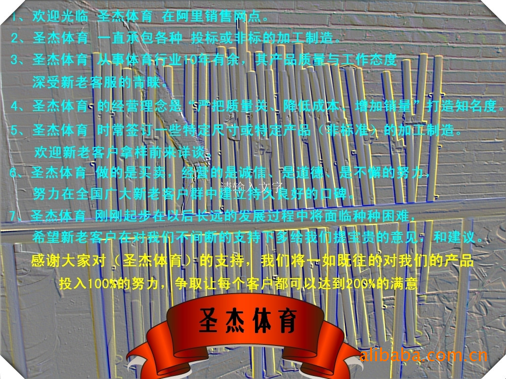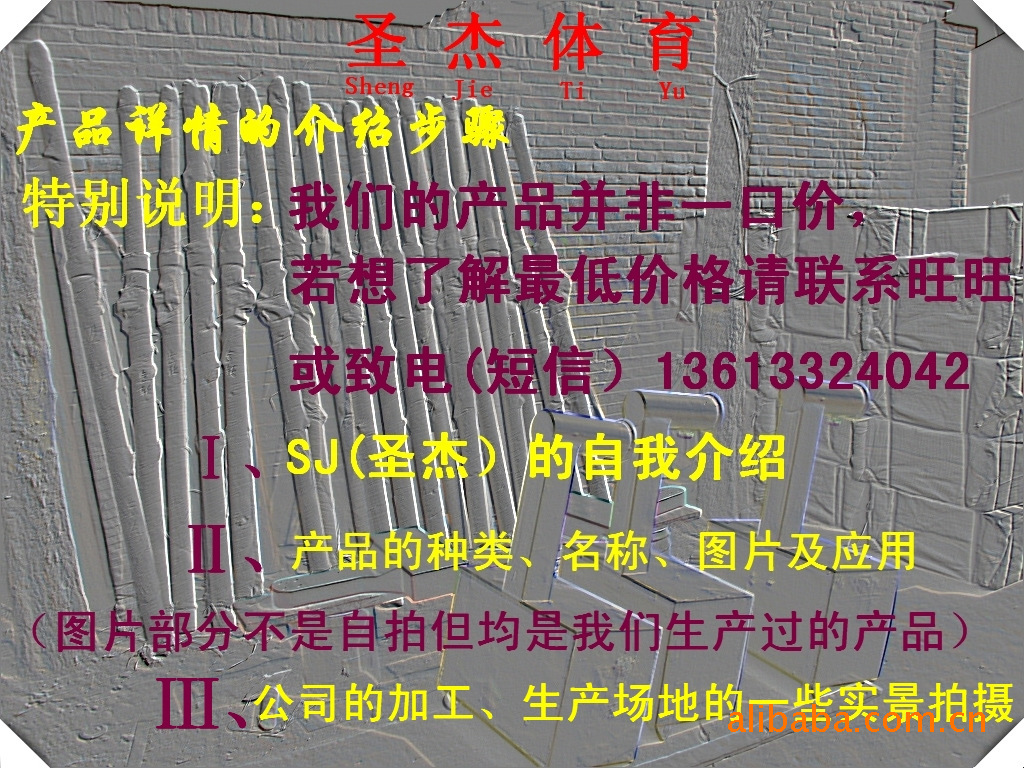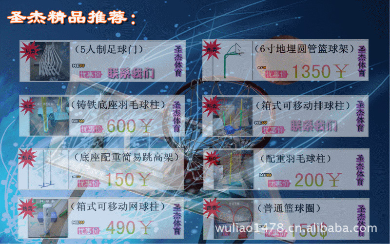 篮球筐,篮板,篮球筐,乒乓球桌,足球球门,排球柱,羽毛球柱,网球柱,跨栏,标枪,铅球,铁饼,哑铃,杠铃,杠铃架,垒球,橡皮球,单杠,双杠,高低杠,肋木,平梯,云梯,体操棒,体操凳,接力棒,联合教练,沙包,沙服,健力碗,标杆,起跑器,跳高,山羊,跳箱,健身路径等...(在体育行业中涵盖99%的产品)