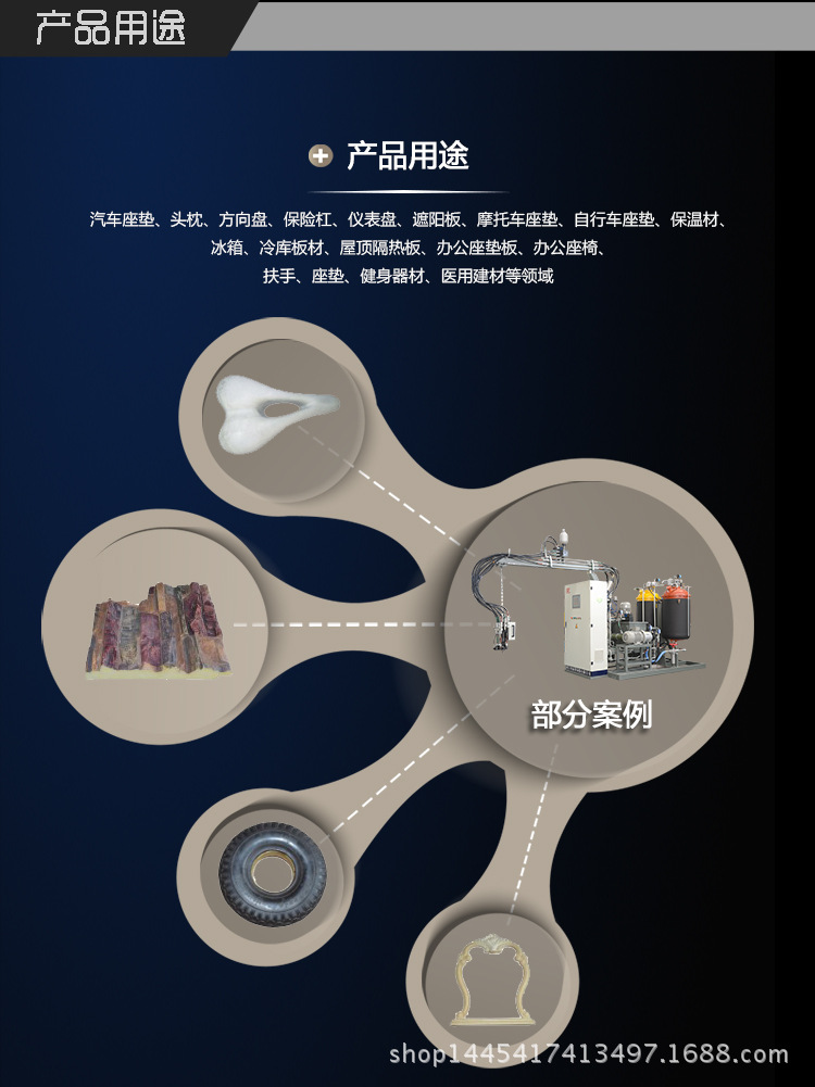 汽车座垫,头枕,方向盘,保险杠,仪表板,遮阳板,摩托车座垫,单车座垫,隔热材质,冰箱,冷藏柜,屋顶隔热板,办公椅,扶手,座垫,健身器械,医疗装置,建筑材质等领域