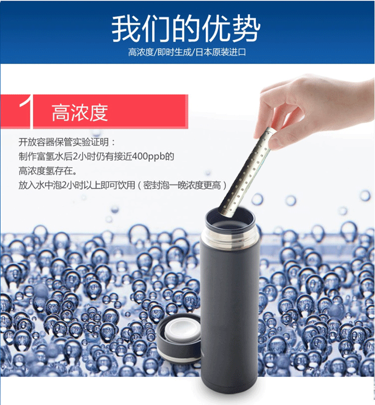 通过使用该产品,普通饮用水可以变为“富氢水”。将“能量氢棒”放入装有饮用水的容器中,即可直接使用。由于氢是宇宙中最轻的气体,因此,如果取出“能量氢棒”,水中的氢会立刻逸出,水会返回原本的正常水中,因此在使用时请小心翼翼。