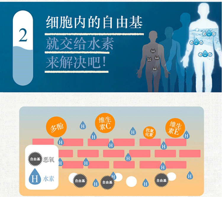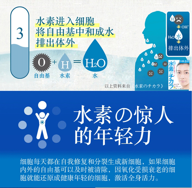 “富氢水”中涵盖的丰沛氢分子在被人体吸收后将分解为氢原子,即所谓的“活性氢”。该活性氢将与体内不停产生的活性氧结合(被认为是所有病症的源于),形成水,除去对人体危害的“活性氧”的效用如“@”所示。nz@”。