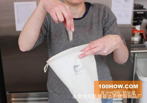 1.将配管嘴的尖端朝下放入配管袋中。请注意,此处未使用任何塑料接口(百分号留意:本文后面用塑料接口装饰嘴),除非您使用期间须要不时更换其他装饰嘴,否则从未必需。