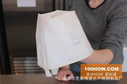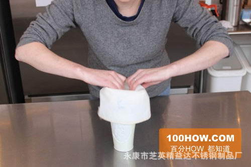 2.将管道袋的尖端向下放入马克杯或玻璃杯中,用手在管道袋的四个侧面上粘贴一个标签,然后将后部开口的边缘折叠到杯的外部,折叠高度几乎是管道袋的一半。现在您可以开始加糖了。